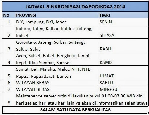 Dalam rangka optimalisasi proses sinkronisasi dan pengaturan traffic pengiriman data maka di buat jadwal sinkronisasi berdasarkan wilayah, hal ini agar beban server dapat diatur, jika melakukan sinkronisasi diluar jadwalnya, maka akan ada pencegahan dari sistem. semoga dapat mempermudah rekan-rekan semua.